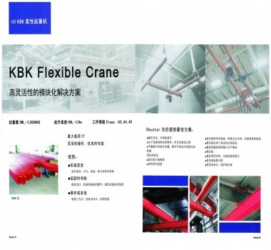 KBK柔性起重機(jī)系統(tǒng)應(yīng)用模塊化設(shè)計(jì)代替?zhèn)鹘y(tǒng)的整機(jī)設(shè)計(jì)概念,將起重機(jī)功能上基本相同的部件制成具有多種用途,有相同聯(lián)接要素和可互換的標(biāo)準(zhǔn)模塊。根據(jù)需要可組成單梁懸掛起重機(jī)、雙梁懸掛起重機(jī)、懸臂起重機(jī)、輕型門(mén)式起重機(jī)及堆垛起重機(jī),還能組成大型自動(dòng)化物料搬運(yùn)系統(tǒng),安全起重范圍覆蓋125kg-2000kg。